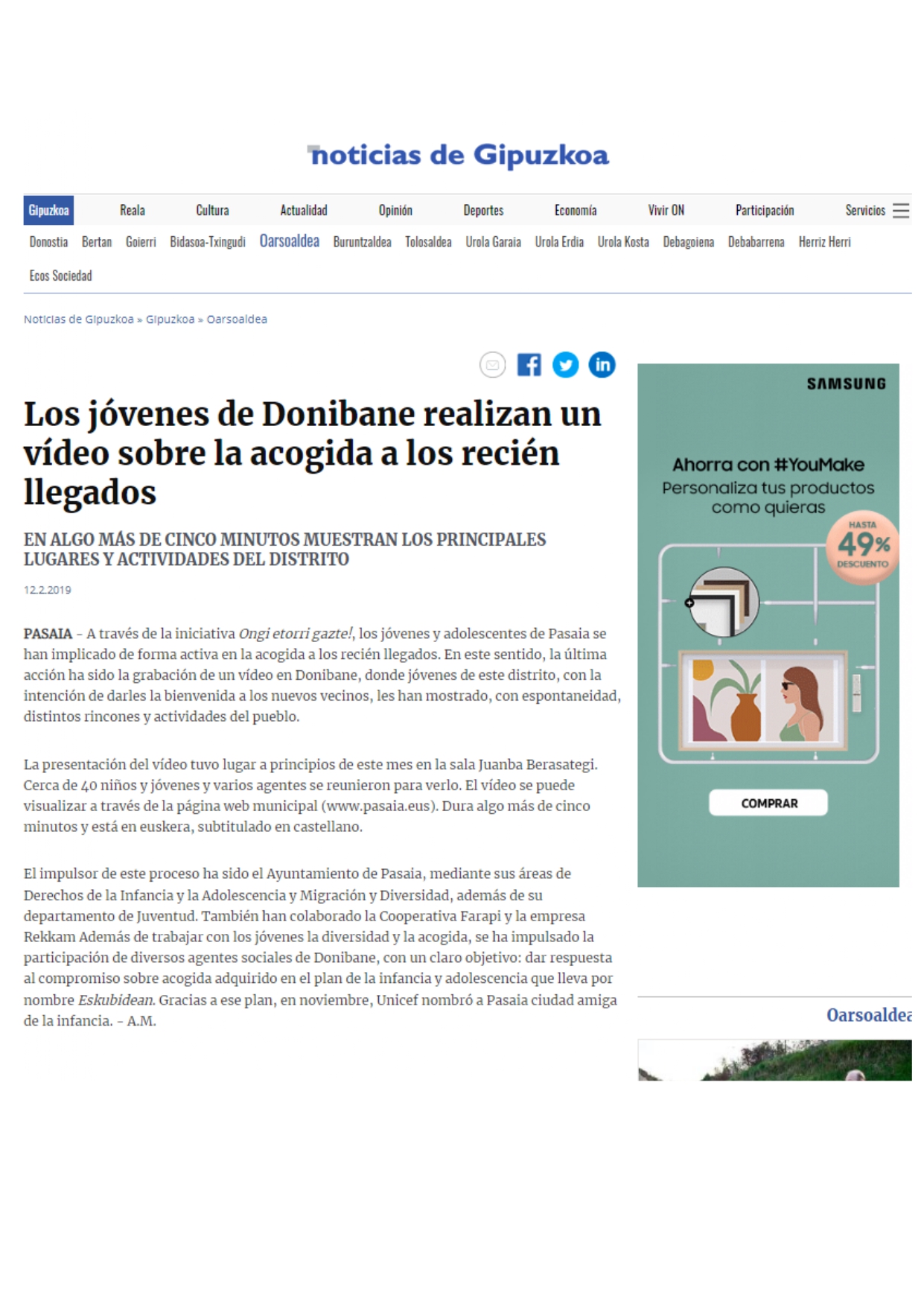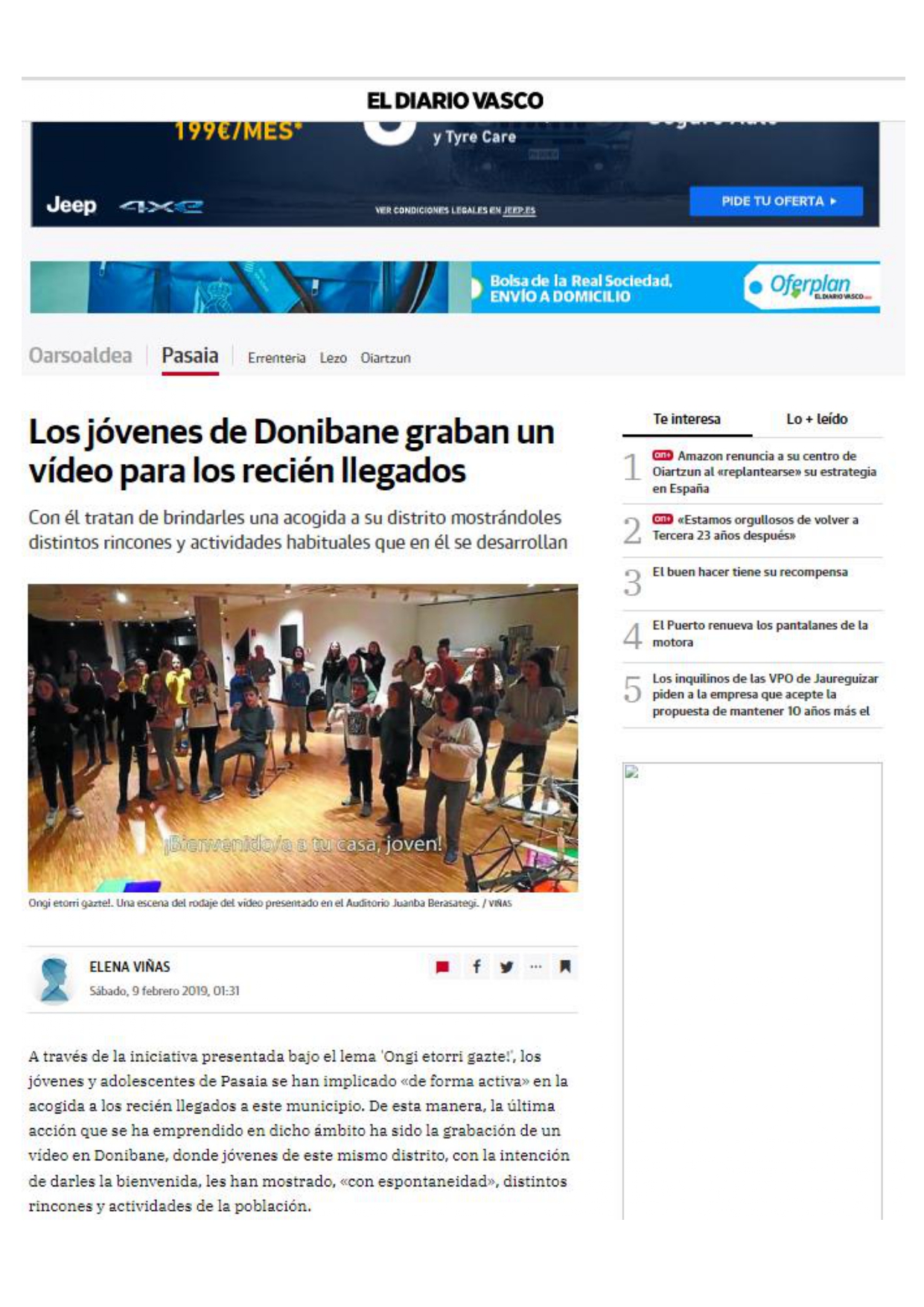 Los jóvenes de Donibane realizan un vídeo sobre la acogida a los recién llegados [Noticias de Gipuzkoa, 2019-02-12]Ikusi