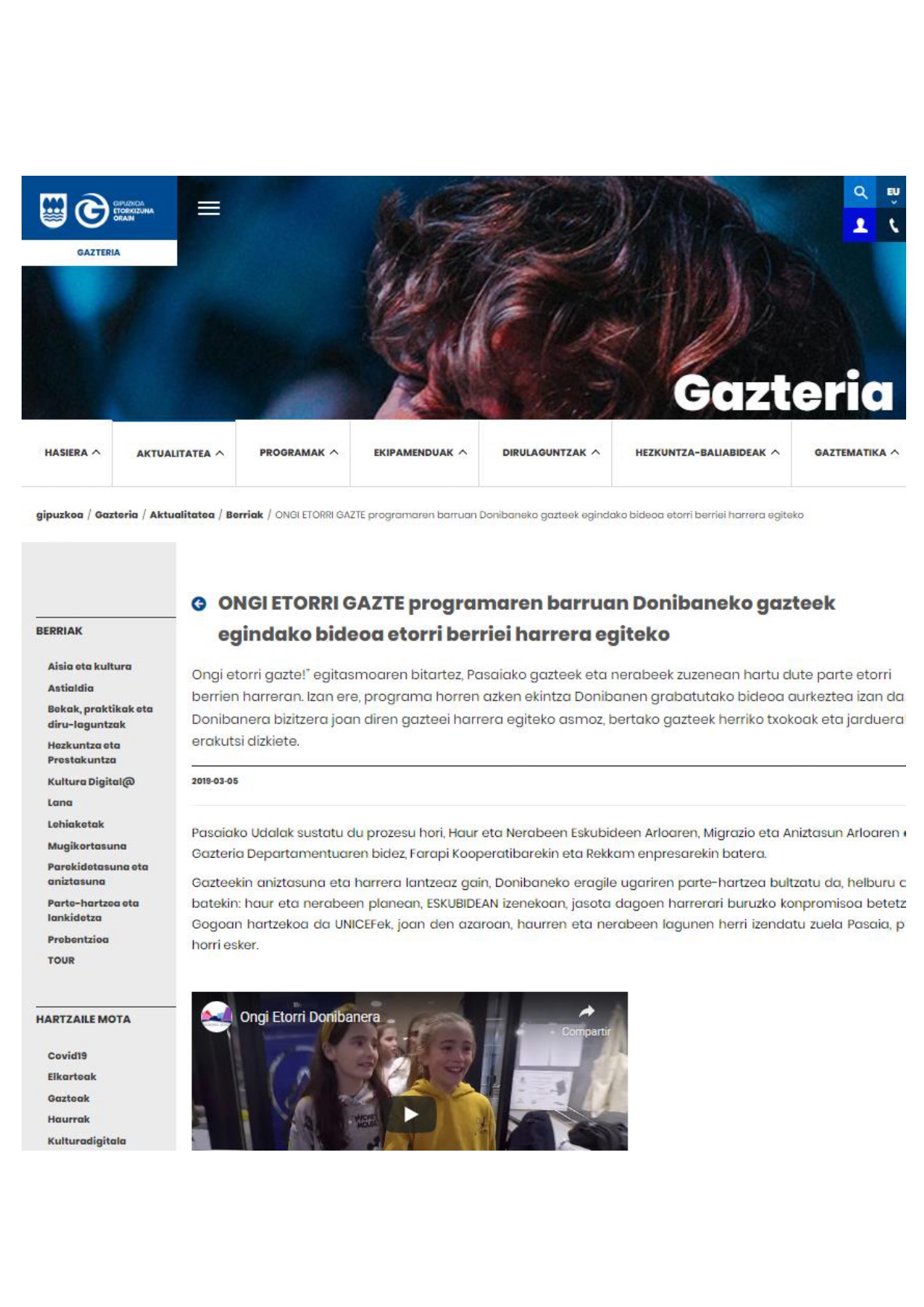 Vídeo realizado por jóvenes de Donibane para acoger a jóvenes recién llegadas/os dentro del Programa ONGI ETORRI GAZTE -DIPUTACION-Ikusi